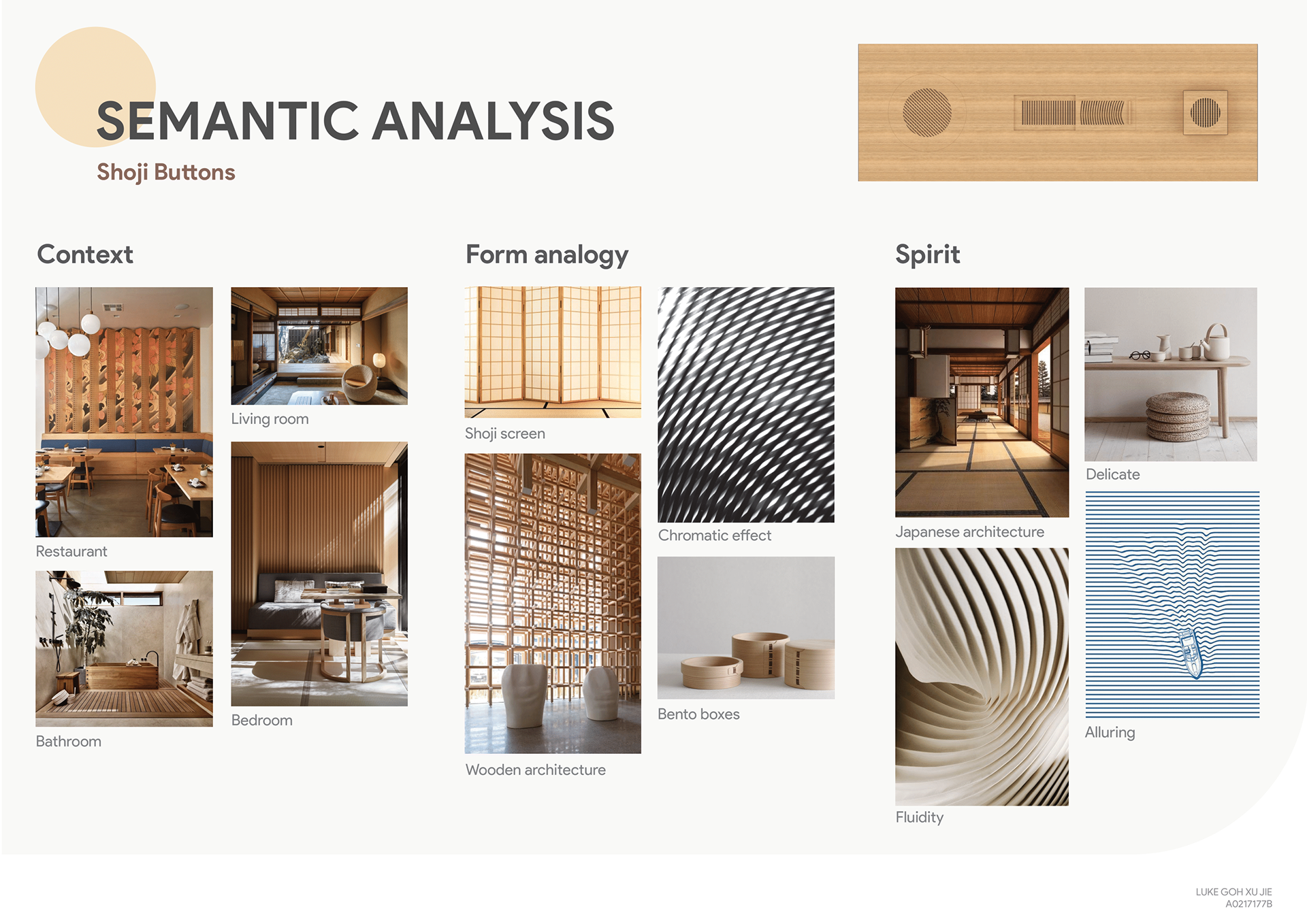 Shoji buttons are a set of buttons designed with affordance in mind, inspired by shoji lamps in Japanese architecture. Using a play of negative spaces, chromatic effects are created when the buttons are interacted with using the moire effect to create these illusions. Dents and bumps on the smooth surface lead the user to the right interaction according to the button they interacted with.